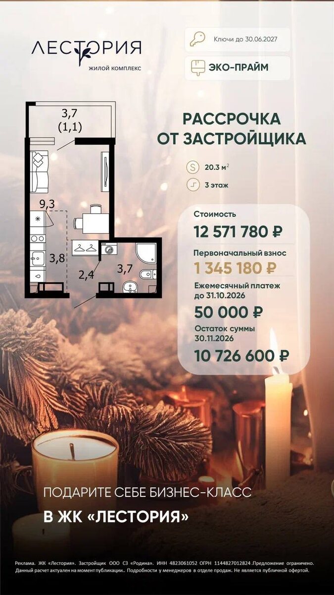 Отличная возможность зайти в бизнес-класс на комфортных условиях. Новогоднее предложение, которое реально работает 👌 Что предлагают сейчас: — первый взнос от 1,2 млн ₽ — фиксированный платёж 50 000 ₽ в месяц — рассрочка действует до 30.11.2026 — ключи до 30.06.2027 Актуальные варианты: ▪️ студии и 1-комнатные квартиры ▪️ площади от 20 до 24 м² ▪️ этажи 3–5 ▪️ стоимость от 11,4 млн ₽ ▪️ без ремонта или с эко-прайм отделкой Примеры: — квартира 20,8 м² — цена 11,47 млн ₽, первый взнос 1,23 млн ₽ — квартира 23,9 м² — цена 12,32 млн ₽, первый взнос 1,32 млн ₽ — квартира 23,6 м² — цена 13,23 млн ₽, первый взнос 1,41 млн ₽ Количество квартир ограничено, условия действуют на выделенный пул. Финал, который важен 👇 Оформляя покупку через меня, вы получаете квартиру в этом ЖК выгоднее, чем напрямую у застройщика — я возвращаю часть своей комиссии в виде бонуса за доверие. Если рекомендуете меня друзьям или близким — финансовую выгоду получаете и вы, и они. В итоге выигрывают все. 💬 Пишите в л