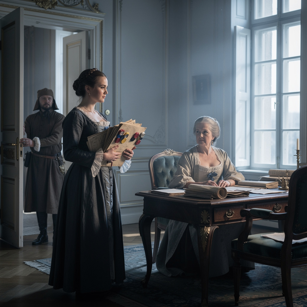 Ровно в семь утра Лиза, в простом темно-сером платье без излишеств, уже стояла у дверей кабинета Екатерины. В руках – пачка свежих депеш и писем в разноцветных сургучных печатях. Нервы были натянуты, как струны клавесина, но на лице – маска спокойного внимания, которую она тренировала перед зеркалом.