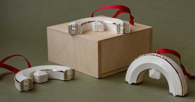 Один из самых узнаваемых памятников конструктивизма — гараж на Новорязанской улице — теперь можно повесить на елку. То, что такой мерч выпустил именно Музей транспорта Москвы, логично — он сам занимает это здание. Это не просто утилитарный гараж, а, можно сказать, манифест эпохи авангарда: смелая форма, выразительная индустриальная эстетика.