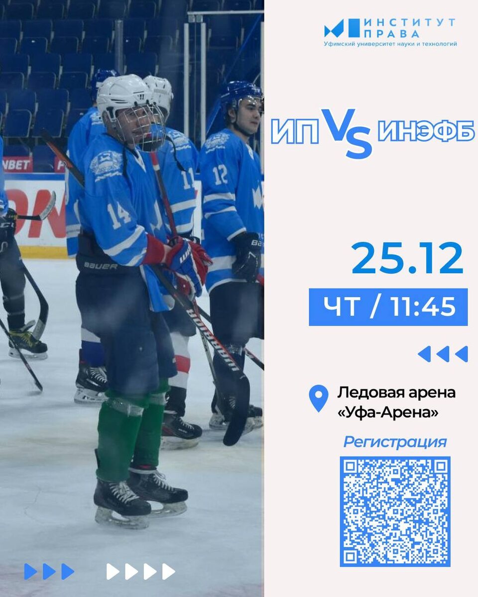 ! 🤩 🏒 Хоккейная сборная Института права выходит на лёд против ИНЭФБ - и без нас им не справиться! 📅 Дата: 25 декабря 🕦 Время начала: 11:45 📍 Место: Ледовая арена «Уфа-Арена» 📌Вход строго по списку (по предварительной регистрации) У ИНЭФБ мощная группа поддержки. А у нас - единство, характер и сила Института права💙 Каждый крик с трибун, каждая эмоция - это дополнительная энергия для наших хоккеистов! Берите с собой одногруппников, друзей и семью - каждый голос на трибунах важен! Вместе поддержим сборную Института права! 💙 Регистрация обязательна: 🔗 https://docs.google.com/forms/d/e/1FAIpQLSfWr5NKHrubfOW8v0Aka12eW5sDHM22eErimS-BMRmoqWee0Q/viewform?usp=header