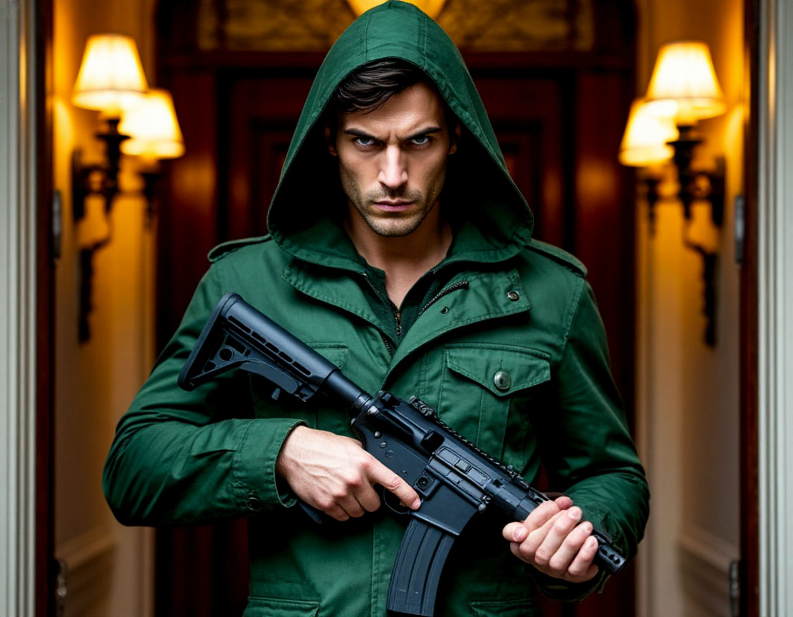Дверь в гостевую комнату (где теперь спал Игорь) буквально вырвало с петель от такого мощного толчка. Он вылетел в проём не как человек, а как разжатая пружина, как тень, материализовавшаяся из самого страха. В его правой руке, твёрдой и уверенной, уже был пистолет. Его лицо... я никогда не видела такого выражения. Весь его привычный каменный нейтралитет испарился, обнажив чистую, оголённую сущность бойца. Глаза сузились до щелей, в них полыхал холодный, безличный огонь готовности. Губы были плотно сжаты, челюсть выдвинута вперёд. Шрам на его щеке казался белее обычного, как молния на грозовом небе.