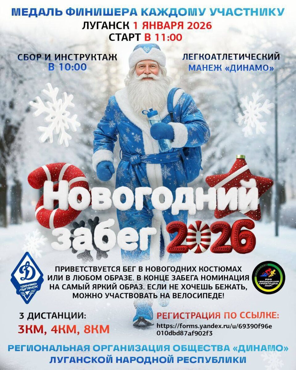 Каждому финишёру обещают медаль. Приветствуются новогодние костюмы и любые образы — будет номинация за самый яркий. 📍Манеж «Динамо», сбор и инструктаж — в 10:00, старт — в 11:00. Регистрация — по ссылке ————— Поддержите канал Подпиской на "Сыны Отечества" или Голосом за канал ✅ подписаться |⚡️проголосовать 📲Наш проект в социальных сетях: Вконтакте, Одноклассники, Дзен, RuTube Теперь мы и в МАХ!