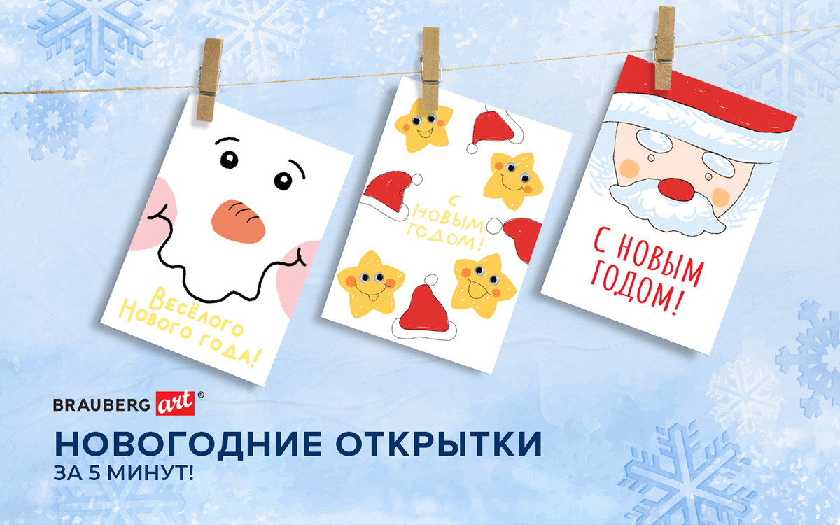 До Нового года – неделя. Без паники! Предлагаем сделать лёгкие открытки, на которые уйдёт всего пара минут, а радовать они будут целый год. Вот 3 интересные идеи, чтобы поднять настроение себе и близким. Для таких открыток идеально подойдёт набор скетчмаркеров BRAUBERG. Целых 80 цветов – хватит на эти и множество других творческих идей. С ними легко работать, а результат получается ярким и аккуратным. Заказать набор для себя или в качестве новогоднего подарка можно на WB или OZON Давайте начнём с простого и милого снеговика! Оранжевым маркером рисуем треугольный нос-морковку. Затем берём розовый маркер и добавляем румянец. Теперь чёрным маркером (тонкой стороной) дорисуем детали: глазки, ротик и несколько штрихов на носу. Остался последний шаг – подписать открытку. Следующая открытка будет «с изюминкой». Жёлтым маркером рисуем звёздочки, а красным – шапочки. Распределите фигуры равномерно по листу, оставив место в середине. Теперь самое интересное – берём объёмные глазки и клеим их