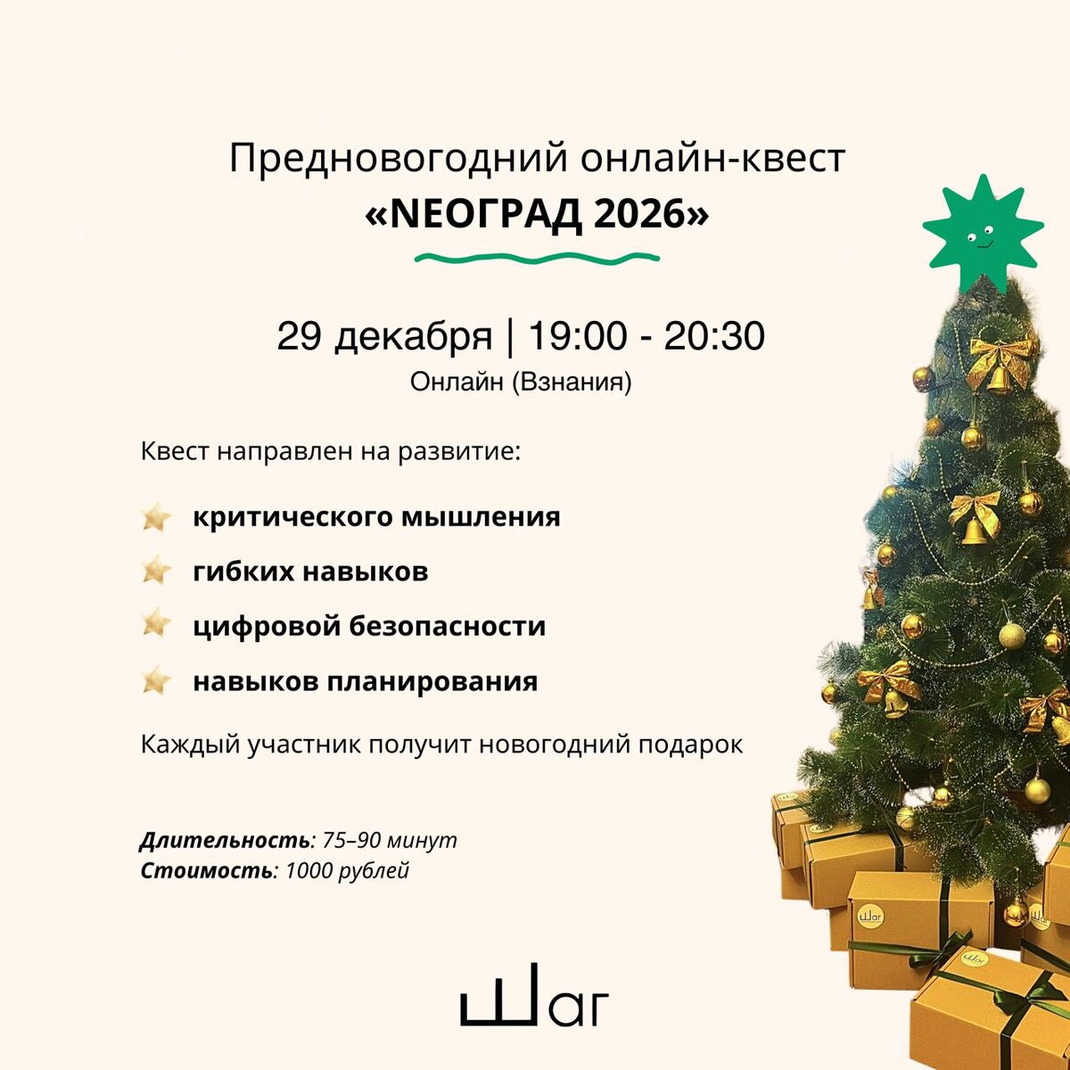» 🎄 🔖Приглашаем ребят 5–11 классов на интерактивную настольную игру-квест, где участники в командах будут управлять городом будущего. В процессе игры дети научатся: - отличать факты от слухов и проверять информацию - соблюдать цифровую гигиену - работать в команде: договариваться, распределять роли, аргументировать свою позицию - ставить цель и превращать её в план действий ✨ Каждый участник получит новогодний подарок по почте. Команды формируются с учётом возраста. Дата: 29 декабря, 19:00 Длительность: 75–90 минут Стоимость: 1000 ₽ ➡️Запись: @dima_step_st