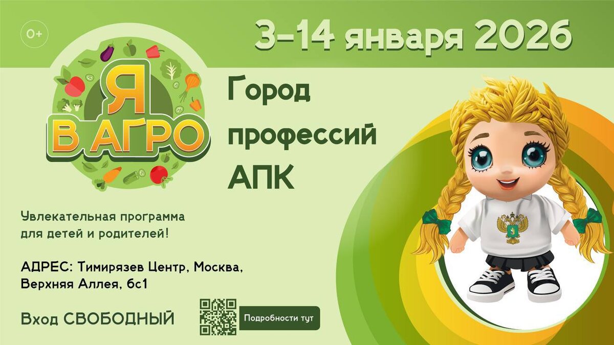 Это очень классный проект, мы были летом в этом познавательном городе профессий на ВДНХ, и это было мега-круто. Наш подробный отзыв здесь. В новогодние каникулы Я в АГРО будет проходить в Тимирязев Центре 📆 с 3 по 14 января 📌 «Тимирязев Центр», Верхняя аллея 6с1, м. Петровско-Разумовская, выход 5. 🔗 Регистрация на треки и мастер-классы с 3 по 5 января откроется 26.12 в 12:00 на сайте ⭐️ Детей ждут два увлекательных трека «Растениеводство» и «Животноводство»: ➡️ через игры и интерактив они узнают, как работает современное сельское хозяйство, и примерят на себя разные аграрные профессии. ⭐️ Подростки погрузятся в цифровой мир АПК: ➡️ ребята попробуют управлять агродронами, с помощью VR-технологий изучат алгоритмы оптимизации сбора урожая и узнают об автоматизации логистики. ⭐️ Для всей семьи подготовлены разнообразные мастер-классы: ➡️ каждый участник сможет создать что-то уникальное своими руками и унести домой не только эмоции, но и результат своего труда! ❄️ Новогодняя пр
