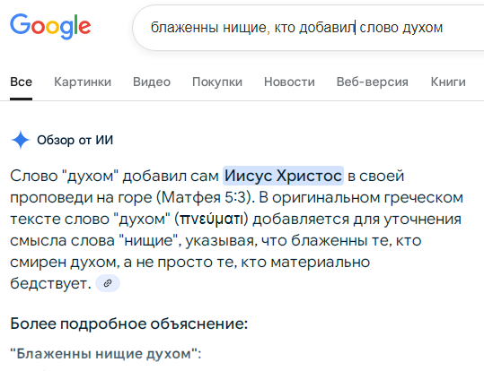 Конечно, многим известна первая в Евангелии сказанная аксиома Иисуса Христа из Нагорной проповеди - "Блаженны нищие (духом), ибо их есть царствие небесное". Это парадоксальное, в современном понимании выражение, растолковывают, как духовная нищета - состояние смирения, осознание своей греховности и полной зависимости от Бога, жажда Его присутствия и духовных благ вместо мирских богатств, что открывает им Царство Небесное и наполняет душу Божьей благодатью и радостью. Но немногим известно, что "дух" появился позднее, причем, в процессе сбора информации, проявилась любопытная особенность ИИ - на запрос об этом, ИИ попытался "пропетлять". И лишь после демонстрации знакомства с греческим текстом Евангелия, а, именно, добавлением в запрос текста - "в оригинале его нет", ИИ "уточнил" ответ и выдал следующее. Ну, в конце-то концов, ничего страшного - всего лишь уточнили слова бога, чтобы не было непоняток. Ведь, в Нагорной проповеди Христос предстаёт истинным толкователем закона Моисеева. Так