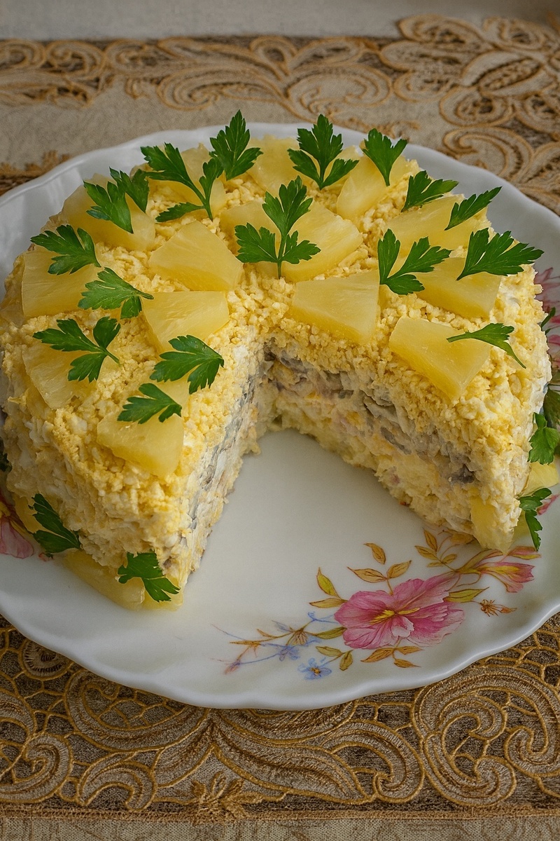 8. Снять форму, украсить яйцом, кусочками ананаса и зеленью.