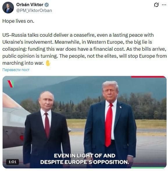 недовольство граждан экономическими последствиями войны. По его словам, именно население, а не политические элиты, способно остановить дальнейшую эскалацию. «Финансирование этой войны действительно имеет финансовые последствия. По мере поступления счетов общественное мнение меняется. Люди, а не элиты, остановят Европу от вступления в войну», — написал Орбан, подчеркивая растущую тревогу европейцев по поводу расходов на вооружение и помощь Киеву. Он также выразил надежду на дипломатическое решение конфликта. По мнению венгерского премьера, переговоры между США и Россией могут привести хотя бы к прекращению огня, а при участии Украины — к устойчивому миру. Орбан отметил, что прежний нарратив о «безболезненной поддержке» войны постепенно рушится в западных странах: население всё чаще осознаёт реальные экономические и социальные последствия участия своих стран в конфликте. Позиция Орбана отражает растущее напряжение внутри ЕС по поводу затрат на украинский фронт и рисков дальнейшей эскал