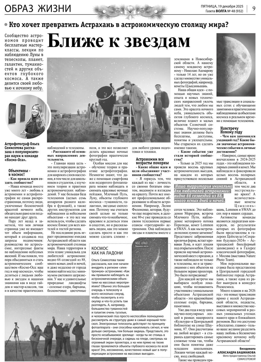 🔭 Ближе к звездам: в газете "Волга" вышло интервью со мной о нашем сообществе "КОСМО-ОСА".