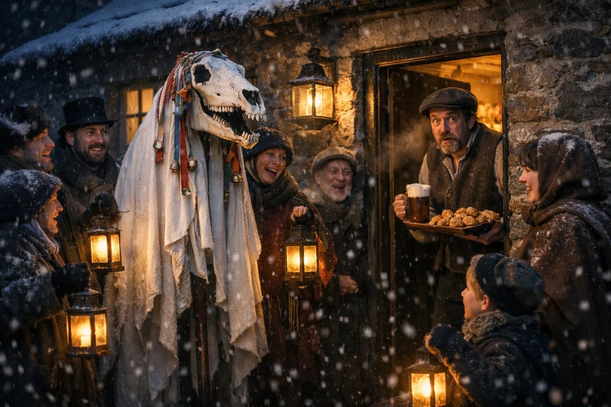 - Mari Lwyd — один из самых эффектных вариантов: максимально запоминается, максимально пугает соседского пса, максимально повышает вероятность, что тебя пустят хотя бы из уважения к театральности.