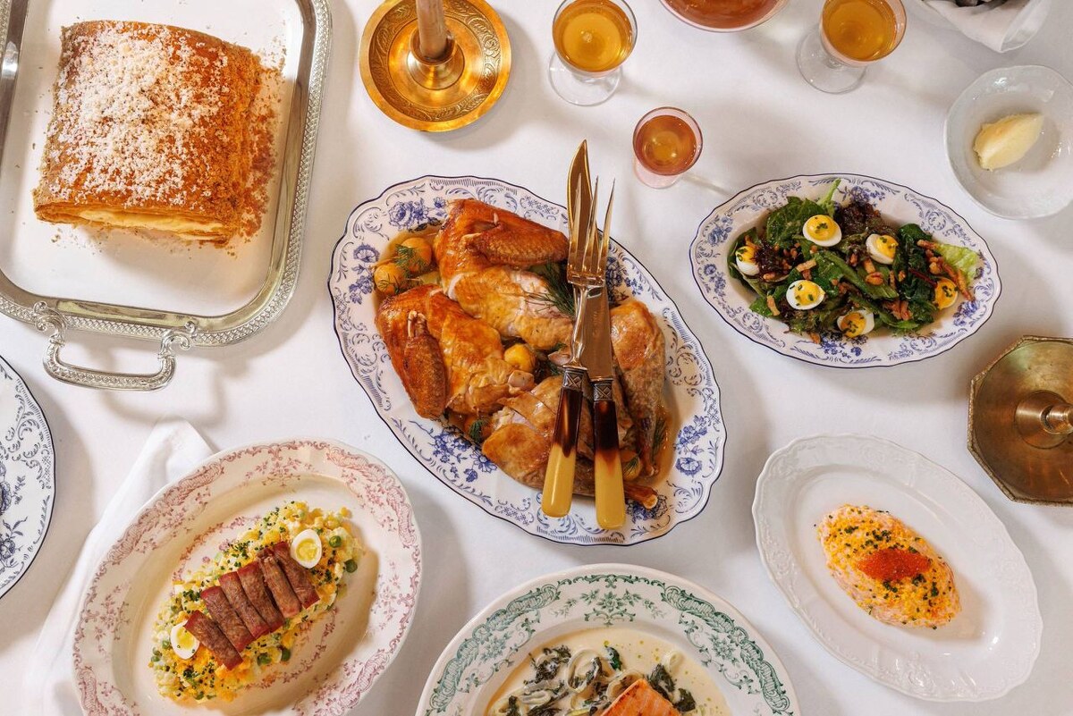 Часть 2. Niki Ещё один сет (16900 ₽) с соленьями из фермерских овощей, холодцом из утки, мимозой с лососем конфи, классическим оливье и не селедкой, а крабом под шубой с маскарпоне и вяленым желтком. На горячее — цесарка с отварным картофелем и томлённой квашенной капустой, на десерт — наполеон с пралине из макадамии и солёной карамели. Заказ до 25 декабря. ЦДЛ Заливное из судака и лосося (6900₽/1 кг), поросёнок (7000₽), фаршированный гречневой кашей и грибами, индейка (5000₽) с апельсинами и имбирным соусом — это всё хорошо, но что ещё лучше: фирменные пирожки (250₽/1 шт.) с разнообразными начинками и пельмени — сибирские (4500₽/1 кг) и с лососем и судаком (7800₽/1 кг). Заказ до 25 декабря. Aquamarine Девять традиционных блюд в подаче на компанию: сельдь под шубой (1600₽/1 кг), мимоза с подкопчённым лососем (4600₽/1 кг), оливье со слабосолёным лососем (4500₽/1 кг) или с телячьим языком (2600₽/1 кг), салат с крабом и авокадо (5000₽/1 кг), а из основных позиций: запечённая с овощами