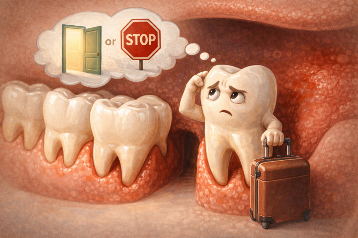 Вопрос, который чаще всего звучит так: «Если не болит — зачем трогать?» С зубами мудрости эта логика почти никогда не работает. По нижним восьмёркам у нас позиция жёсткая: их мы удаляем практически всегда. Это эволюционное наследство — челюсти у современного человека стали компактнее, а зубов осталось столько же. Места для нижних восьмёрок чаще всего просто нет. Даже если зуб ещё не прорезался, на КЛКТ мы его видим — и понимаем, что он будет стремиться выйти и начнёт давить на седьмой зуб. Дальше запускается цепочка: нарушается смыкание, появляются гиперконтакты, перегружаются мышцы, страдает сустав. Щелчки, боли, дисфункция ВНЧС — всё это мы регулярно видим именно как последствия «спокойных» восьмёрок. С верхними зубами мудрости все немного иначе. Они расположены высоко, и, например, в 9 лет лезть за зубом, который буквально под глазом, — не лучшая идея. Но к 14–15 годам, когда он опускается ниже, мы чаще всего тоже его удаляем. Разве что есть редкие ситуации, когда верхнюю восьмёрку