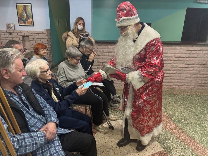 Создавать праздничное настроение журналистам помогал друг редакции, артист, волонтер Николай Сивчук, который выступил в роли Деда Мороза. Кроме книг и газет, подопечным пансионата для престарелых и инвалидов передали подарок от ребят из социального приюта «Огонек» – новогодние открытки ручной работы с добрыми пожеланиями. Вместе с Дедом Морозом постояльцы учреждения исполнили бессмертный новогодний хит «В лесу родилась елочка» и сделали фото на память. Газеты и книги в подарок редакция «Шахтинских известий» привезла также для пациентов домов сестринского ухода №1 и №2. Пациенты от всей души поблагодарили гостей за подарки и внимание.