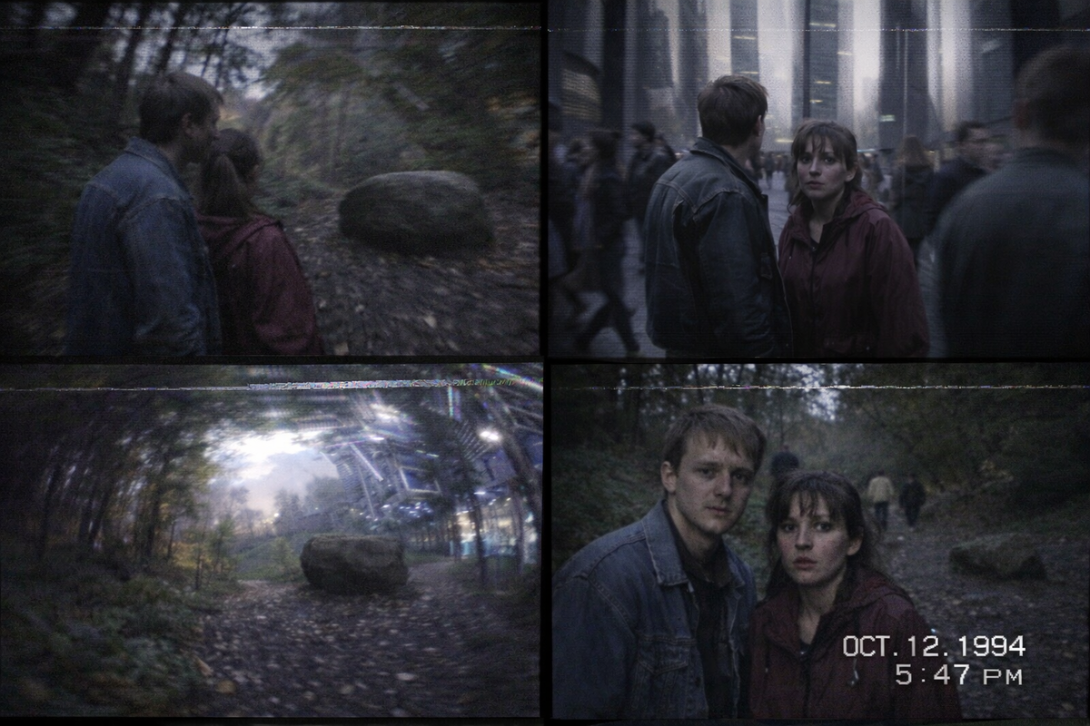 Они дошли до камня. Какого именно — они потом спорили. Один и тот же или нет. Формой похож. Место — совпадает. Но Анна утверждала, что поверхность была другой. Более гладкой. Олег говорил, что камень словно «дышал» теплом, хотя вечер был холодный. Контакт длился секунды. После этого — провал. Не вспышка, не удар, не потеря сознания. Просто в какой-то момент они оказались в другом месте, не поняв, как сделали шаг. Небо было другим. Свет — резкий, холодный, без привычных теней. Вокруг — строения, которых не могло быть.