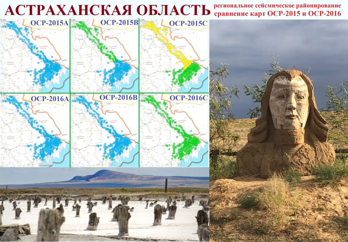 В рамках создания приложение "Живые карты сейсмического ожидания в регионах юга России" обработана информация ожидаемой сейсмической интенсивности региона Российской Федерации Астраханская область. На фото представлены сравнительные данные ожидаемой сейсмической интенсивности по картам ОСР-2015А,В,С и ОСР-2016А,В,С.