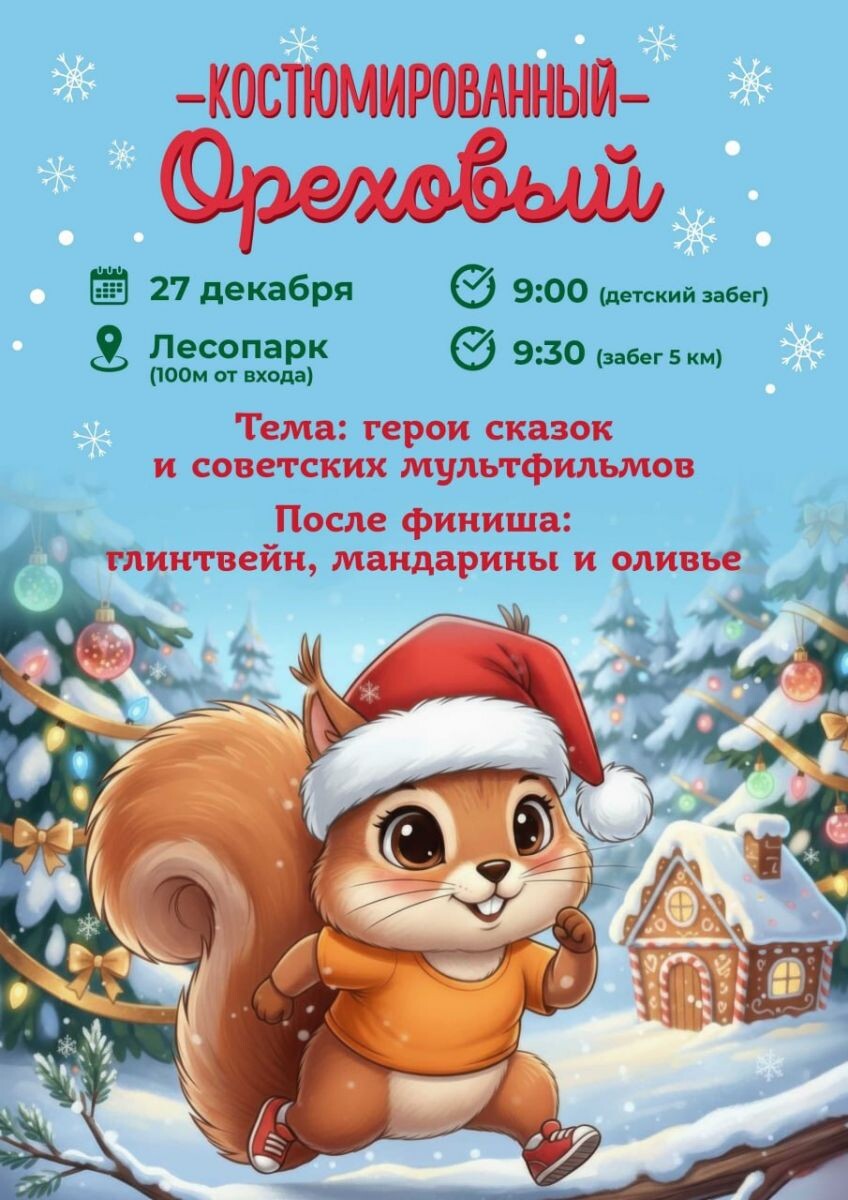 27 декабря в Лесопарке Рязани состоится ежегодный костюмированный «Ореховый забег», посвящённый героям сказок и советских мультфильмов. В этом году участие могут принять даже самые маленькие — для детей организованы забеги на 500 метров и 1 километр, старт которых состоится в 9:00 в сопровождении Деда Мороза. Дети постарше и взрослые пробегут традиционную дистанцию — 5 км, старт в 9:30. Сбор участников — у резиденции Деда Мороза. Организаторы приглашают всех приходить в новогодних костюмах и брать с собой мандарины, хлопушки и угощения для общего чайного стола на финише. После забега всех ждёт тёплое чаепитие в праздничной атмосфере.