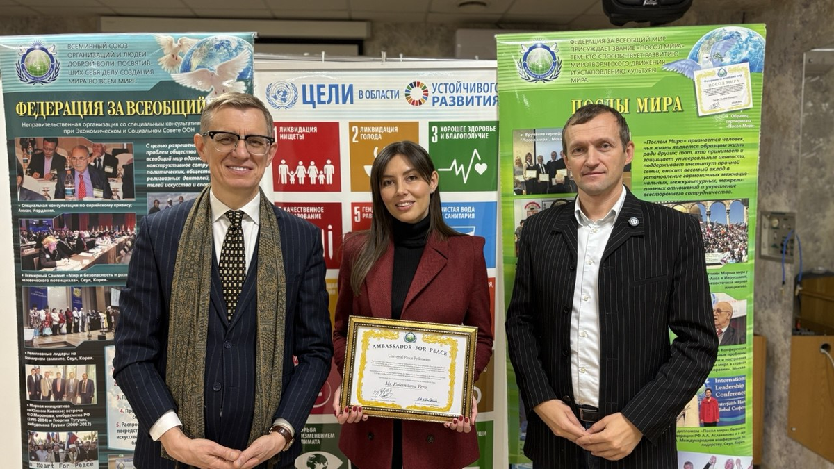 23 декабря в Посольстве мира в Москве прошла торжественная церемония присуждения почётного звания «Посол мира» Федерации за всеобщий мир. Звание было присвоено Вере Колесниковой — общественному деятелю и представителю культурного сектора, члену департамента по культурным проектам Международного дипломатического клуба «Amicability». Федерация отмечает этим званием людей, которые укрепляют культуру мира через диалог, взаимное уважение и созидательные инициативы. Речь не о формальном признании, а о доверии и ответственности — продолжать работу, которая помогает людям находить общий язык и видеть друг в друге человеческое достоинство. Вера Колесникова много лет работает в международной среде. В её профессиональном опыте — туристическая сфера и более трёх лет работы бортпроводником в авиакомпании «Аэрофлот». По словам Веры, именно эта профессия помогла глубже почувствовать многообразие мира и осознать личную миссию — содействовать культурной интеграции разных стран. Одно из направлений её д
