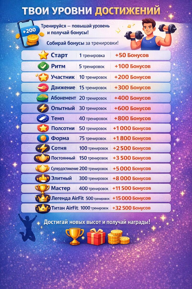 Мы усилили программу лояльности и сделали акцент на бонусах за регулярные тренировки. 📌 Денежный кэшбэк 2% больше не применяется, зато теперь вы получаете больше бонусов за посещения и уровни, которые можно использовать для оплаты тренировок и абонементов. Все актуальные условия — на сайте: airfit.ru/loyalty Если есть вопросы — с радостью подскажем 😊