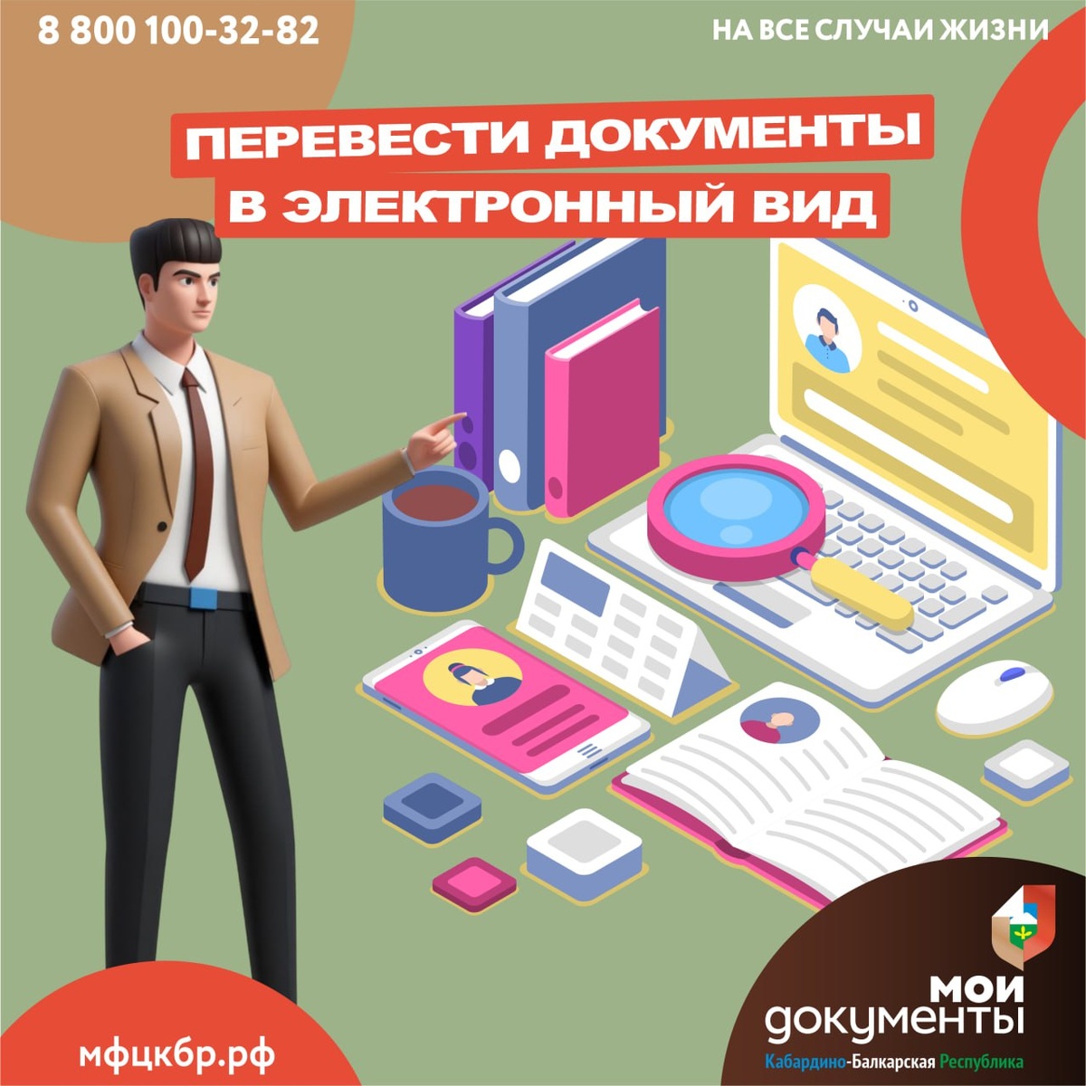 важных документов. Такая возможность появилась после внесения изменений в Постановление Правительства №1818 от 25 октября 2021 года. ✅Электронный дубликат, в отличии от копии документа, имеет юридическую силу, равноценную оригиналу и подлежит хранению в личном кабинете заявителя на Едином портале «Госуслуги» бессрочно. 🤳Для предоставления услуги в центрах «Мои Документы» Кабардино-Балкарской Республики заявителю необходимо предоставить документ, удостоверяющий личность, а также оригиналы документов, подлежащих переводу в электронный вид. Специалист отсканирует каждый документ в отдельности, заверит квалифицированной электронной подписью, после чего, по защищённым каналам направит его в систему портала «Госуслуги». 🗂 Все документы сгруппированы по 19 направлениям, в их числе: - свидетельства о государственной регистрации актов гражданского состояния; - документы о трудовой деятельности; - документы о трудовом стаже; - документы об образовании; - сведения о доходах; - документы воин