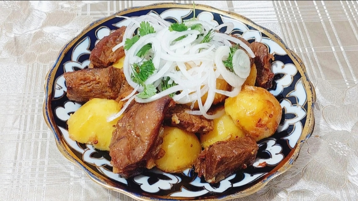 Судя по фото, это казан-кебаб из говядины с картофелем и луком. Ниже — классический простой рецепт (возможно, вы имели в виду *«простой казан-кебаб»*, а не «прозрачный»).