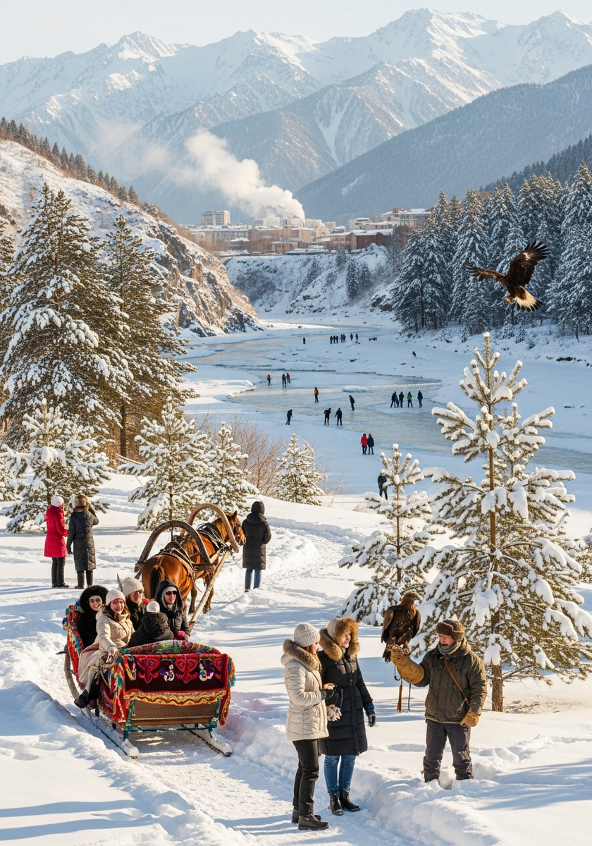 Зимой парк превращается в сказочное царство. Работают отапливаемые гостевые дома, можно совершить прогулку по заснеженным тропам или добраться до смотровой площадки. Для опытных туристов доступны маршруты к леднику Ак-Сай.
