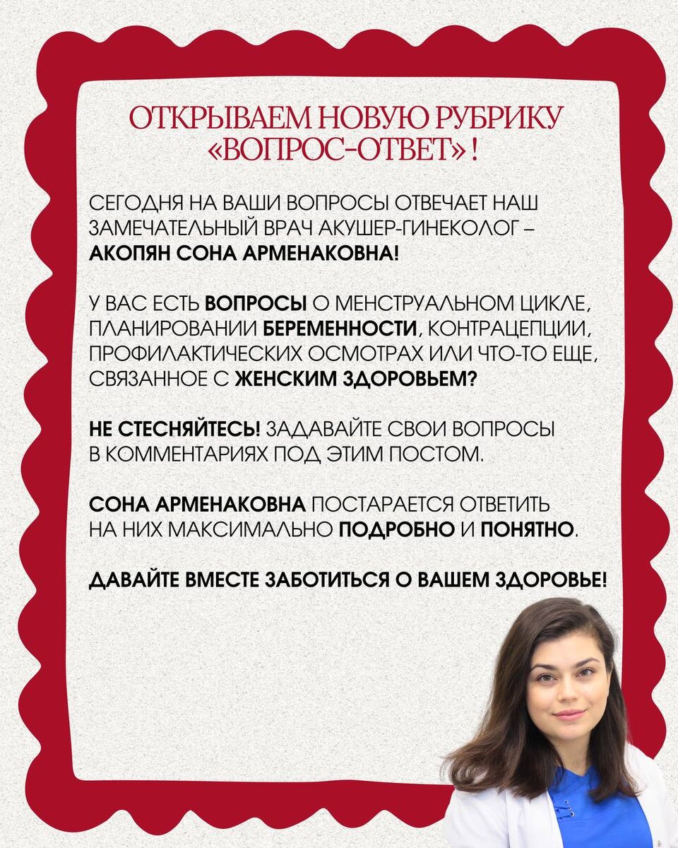 »! Долгожданная рубрика, где Вы можете получить ответы на самые важные и волнующие вопросы о женском здоровье! 🫶 Сегодня на Ваши вопросы отвечает наш замечательный врач акушер-гинеколог – Акопян Сона Арменаковна! ❣️ У вас есть вопросы о менструальном цикле, планировании беременности, контрацепции, профилактических осмотрах или что-то еще, связанное с женским здоровьем? Не стесняйтесь! Задавайте свои вопросы в комментариях под этим постом. ➡️ Сона Арменаковна постарается ответить на них максимально подробно и понятно. Давайте вместе заботиться о вашем здоровье! 🌼❤️