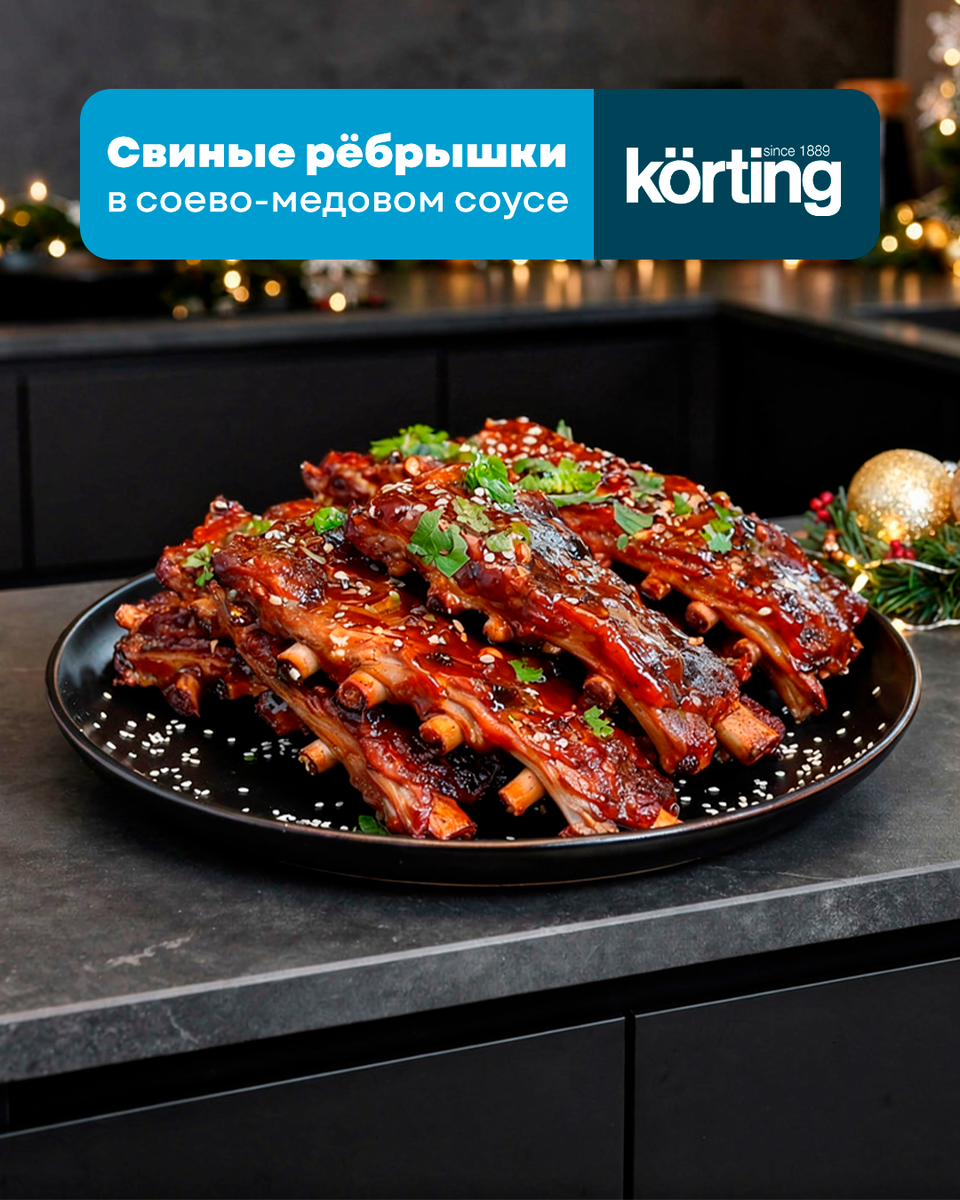 Свиные рёбрышки в соево-медовом соусе — это не просто горячее блюдо, а настоящее украшение праздничного стола. Их эффектный вид и соблазнительный аромат пряностей и мёда создают особое предвкушение. Ингредиенты: 🔹 Свиные рёбра — 1 кг 🔹 Соевый соус — 6 ст. л. 🔹 Мёд — 2 ст. л. 🔹 Томатная паста — 3 ст. л. 🔹 Горчица — 2 ч. л. 🔹 Чеснок — 4 зубчика 🔹 Молотый чёрный перец — 1 ч. л. 🔹 Молотая паприка — 1 ч. л. 🔹 Соль — по вкусу Приготовление: 🔹 Смешайте соевый соус, мёд, томатную пасту, горчицу, пропущенный через пресс чеснок, перец и паприку. 🔹 Промойте и обсушите рёбра, затем обмажьте их полученным маринадом со всех сторон. 🔹 Выложите рёбра на застеленный пергаментом противень, накройте фольгой и запекайте 50 минут в разогретом до 180°C духовом шкафу Korting на режиме «верхний и нижний нагрев с конвекцией». 🔹 Снимите фольгу, увеличьте температуру до 200°C и запекайте ещё 15 минут на режиме «гриль» до образования румяной корочки, периодически поливая маринадом. Подобрать духовой