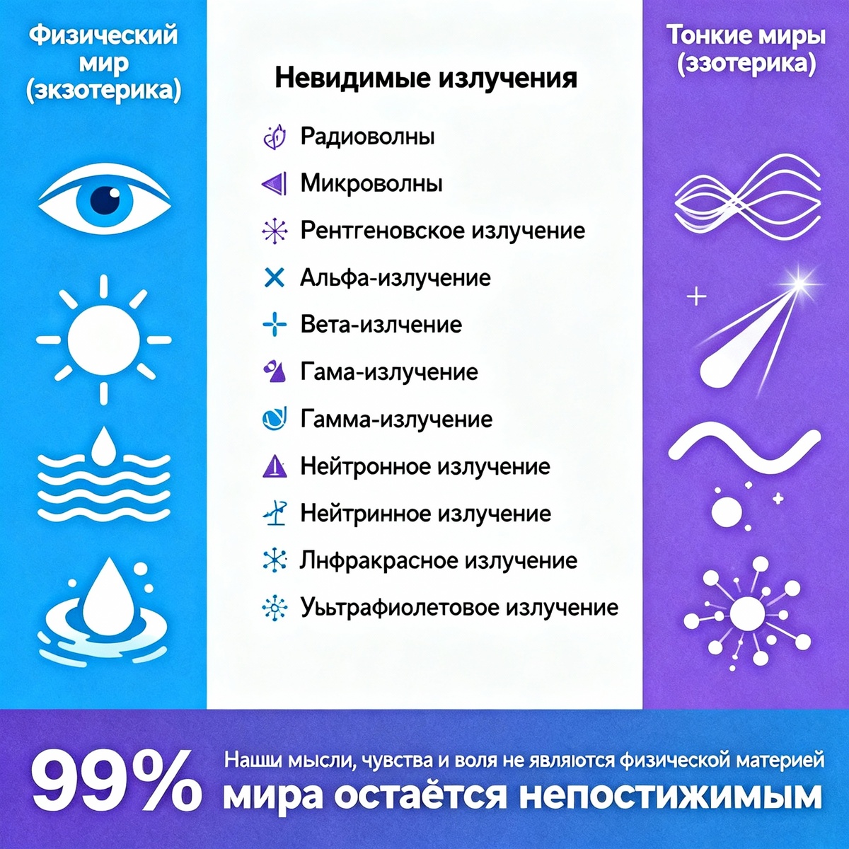 Если вы не осознаёте и/или не улавливаете разницы между физическим миром, который вы легко воспринимаете посредством ваших пяти проявленных органов чувств (экзотерический мир), и тонкими мирами, которые вы в обычной жизни не воспринимаете (эзотерический мир), то даже в момент, когда вы слушаете что-то об эзотерическом мире, ваше сознание невольно будет сползать в сторону привычного вам мира и вы упустите что-то очень важное – возможно, саму суть. Как же постараться сохранить внимание в векторе эзотерики, несмотря на то что о ней вы можете знать мало или не знать вовсе. Для начала давайте сделаем небольшой переход – давайте посмотрим на вполне физические явления, для нас невидимые и не ощущаемые непосредственно, но о которых мы знаем доподлинно. Радиоволны, микроволны, рентгеновское излучение, альфа-излучение, бета-излучение, гамма-излучение, нейтронное излучение, нейтринное излучение, инфракрасное излучение, ультрафиолетовое излучение и ещё много чего (не менее пары сотен излучений), н
