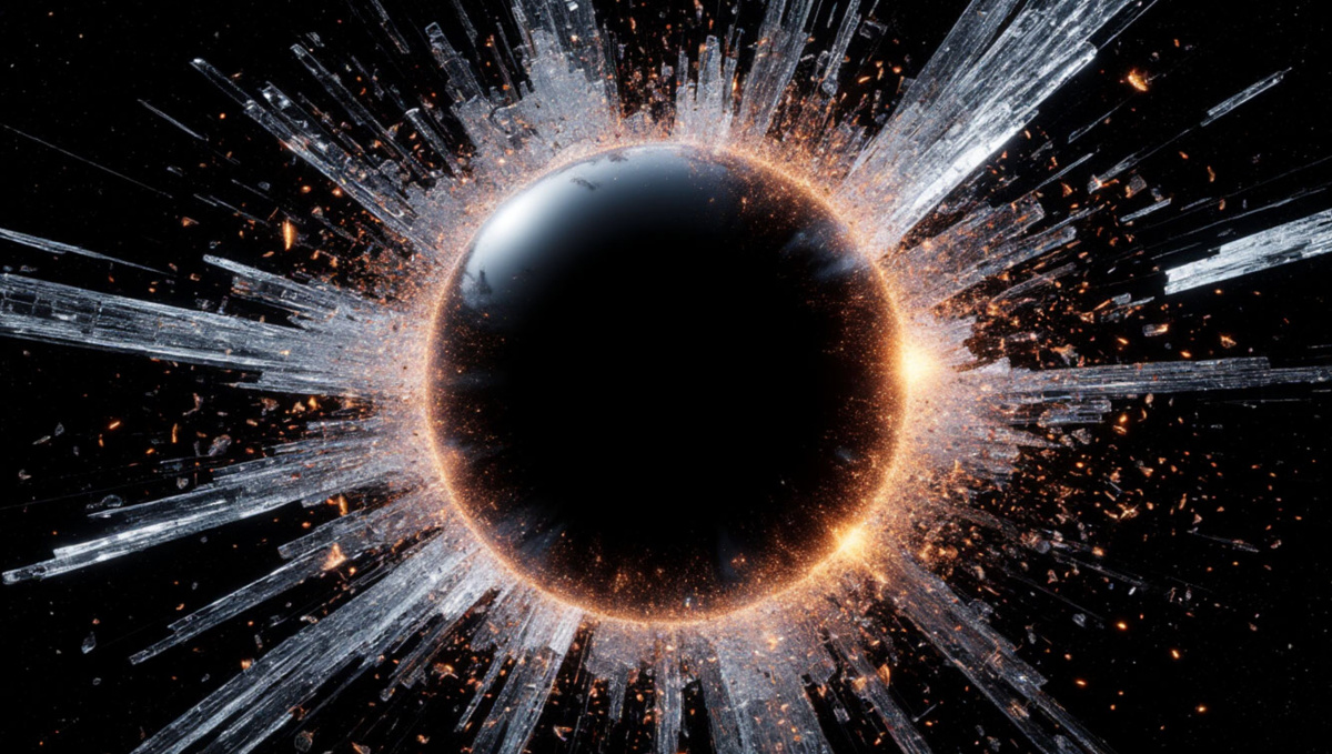 Система «Эхо Китарры» проявилась на экране не как скопление светил, а как зловещая визуальная метафора, созданная корабельным компьютером: идеально черный круг, «Хрустальный Шар», окруженный хаотичным, застывшим ореолом из обломков света. Звезды здесь не горели — они были разбиты и замерли в момент взрыва, словно брызги застывшего стекла.