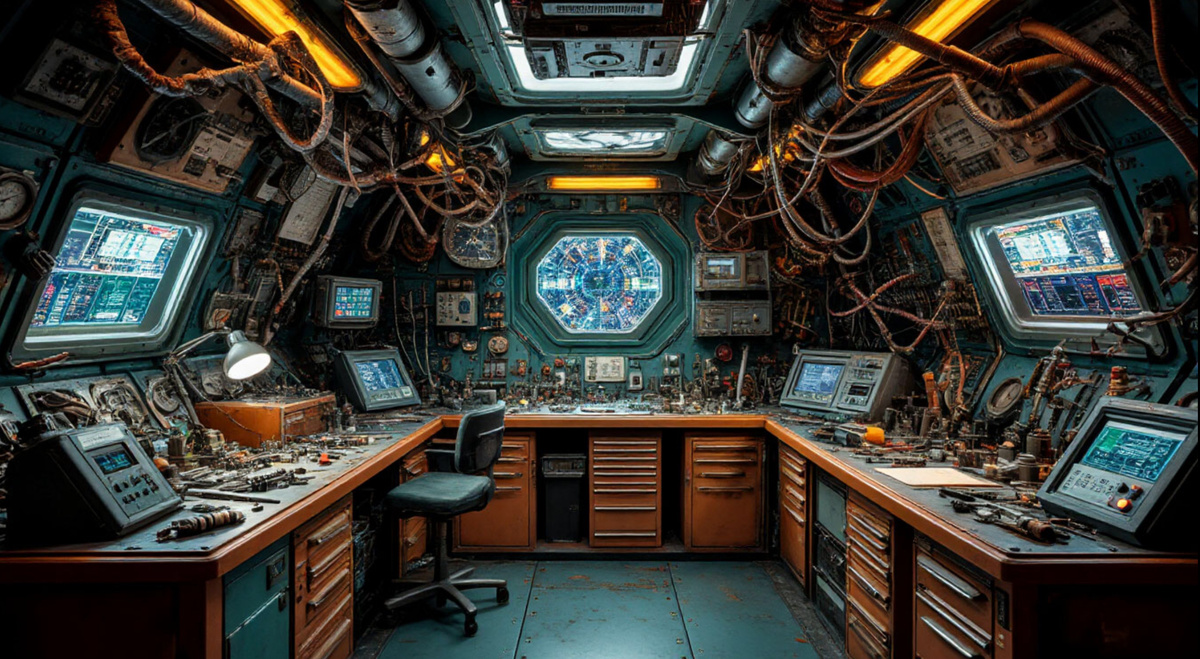 Здесь царил иной вид хаоса. Если на верхних палубах был музей разобранной жизни, то здесь была мастерская безумного часовщика. В воздухе висели трубы, платы, кабели, инструменты — все аккуратно отсоединённые друг от друга и застывшие в идеальном беспорядке. Системы были отключены, но не мертвы — слабые индикаторы пульсировали случайными цветами, словно мозг в коме генерирует бессмысленные сны.