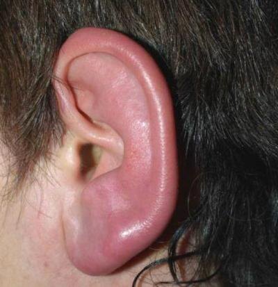 В воспалительный процесс вовлекается ушная раковина целиком: и в области