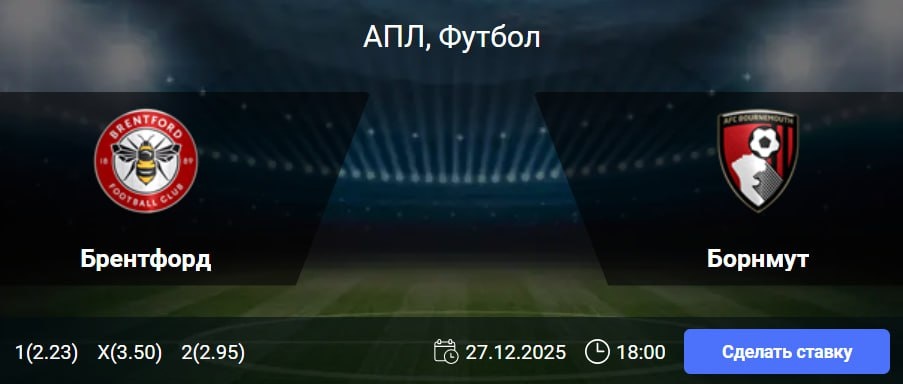 Обе команды, находясь во второй половине турнирной таблицы, стремятся улучшить свои позиции. Учитывая высокую плотность результатов, серия побед может кардинально изменить их положение и приблизить к еврокубковой зоне. Очевидно, что и «Брентфорд», и «Борнмут» выйдут на поле с единственной целью — победить, сделав ставку на атакующий футбол. 🎯 1X и ТБ (2.5) 🎲 кф (2.41) 👉 СДЕЛАТЬ СТАВКУ В БК WINLINE 🎁 ФРИБЕТ WINLINE - 3000₽ (промокод: BETWIN) 👉 СМОТРЕТЬ ПРОГНОЗ 👇 Подпишись на нас 🧿 ВКонтакте ✈️ Телеграм 📎 Сайт