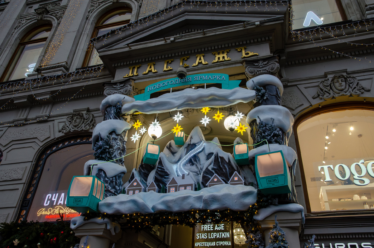 А сейчас мы перейдём Невский и заглянем в Пассаж - один из старейших торговых домов города. Входная группа его оформлена необычно - никаких вам ёлочек и прочих явных атрибутов праздника. Наверное, с намеком на то, как и где отмечают Новый год главные местные покупатели🤣.