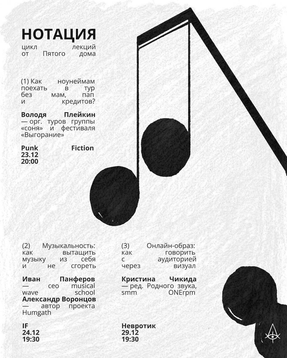 «Нотация» от инициативной группы Пятый Дом с тонкой и актуальной темой для музыкантов и других творческих профессий. 🎧 Иван Панферов (ceo mw-school) и Александр Воронцов (автор Humgath) — Музыкальность. Как вытащить из себя музыку и не сгореть. где: If бар когда: 24 дек, ср 19:30 вход free потому что суета еще никого до добра не довела. приходи отдохнуть и классно поговорить.