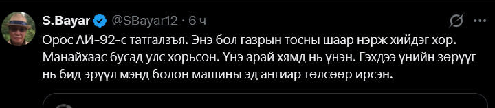 Виновата, естественно, Россия, хотя поставки идут по плану. Упражняются в злословии в адрес РФ не только демшиза, но и такие занятные перцы монгольской политики как давнишний посол и премьер С.Баяр. Оказывается, Россия делает плохой бензин, ядовитый, "из нефтяных отходов" (как это? - ПМ), Да еще и этилированный, и не по тому стандарту: якобы, Евро 2, а хочется Евро 5. Платить, правда, по стандарту Евро 5 не хочется, ну то такое... Кстати, в России тетраэтилсвинец для выработки бензина запрещен давным давно, но кого из демшизы это волнует? #хроникидемшизы 🇲🇳 Планета Монголия. Обсудить пост вы можете в 🇲🇳 Монгольском чате