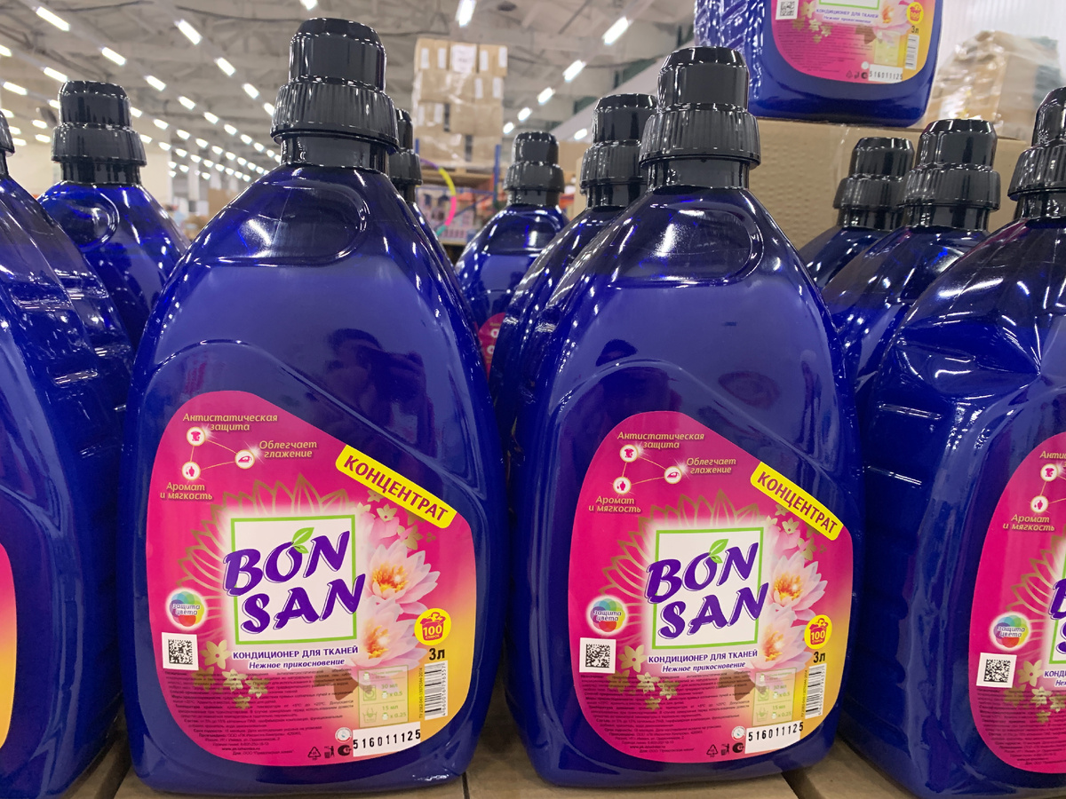 В наличии есть кондиционер для белья BonSan с ароматом Нежное прикосновение. Это концентрат с антистатическим эффектом. Объем 3 литра. Одного флакона кондиционера хватит на 100 стирок. Изготовитель Россия. Цена 142 рубля.