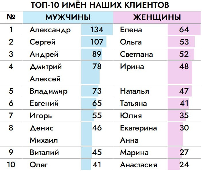 ? На днях мы решили почувствовать себя 🤓 аналитиками данных. Выгрузили из нашей amoCRM базу данных с 2020 года - это 3353 карточки. Сюда попали все: и те, с кем мы работали ранее, и те, кто только заключил договор, и даже те, кто просто интересовался нашими услугами. Мы отфильтровали спам, убрали дубли и решили посмотреть: а кто они, наши люди? У нас получилось своеобразное мини-исследование. И вот к каким выводам мы пришли ⬇️ 📊 Битва Титанов: Топ самых популярных имен Если верить нашей статистике, в России доминируют Александры и Елены. Отрыв от конкурентов колоссальный! Часть имён набрало одинаковое количество "голосов" и делят одно место, например Дмитрий и Алексей. 🏆 Мужской пьедестал: 1️⃣ Александр — абсолютный лидер (134 человека). 2️⃣ Сергей — уверенное серебро. 3️⃣ Андрей — замыкает тройку. 🏆 Женский пьедестал: 1️⃣ Елена — королева рейтинга (64 человека). 2️⃣ Ольга — на втором месте. 3️⃣ Светлана — бронза. 🤔 О чем это говорит? Мы задали себе вопрос: отражает ли