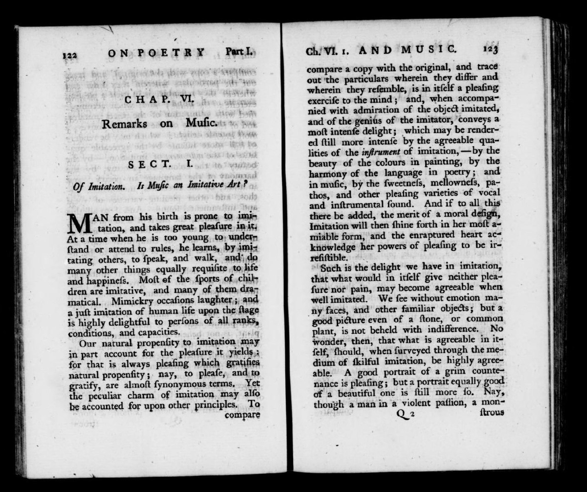 В «Эссе о поэзии и музыке» (1778) Джеймс Битти оспаривает идею Аристотеля о музыке как подражании. Если живопись копирует природу, то музыка воздействует на душу иначе. Прямую имитацию звуков (лай собак, скрип) он считает неуместной, а изображение физической высоты нотами — каламбуром. Суть музыки — в выразительности.