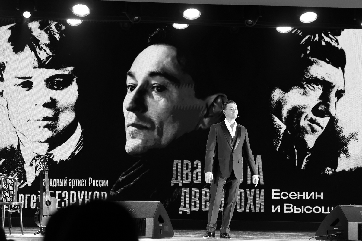 В рамках проекта «Выдающиеся актёры в Кремле» в Государственном Кремлёвском Дворце состоялся авторский вечер народного артиста России Сергея Безрукова «Два поэта». Он объединил в рамках одного моноспектакля творчество Сергея Есенина и Владимира Высоцкого, казалось бы, таких разных, на первый взгляд, авторов, у которых, между тем, при ближайшем рассмотрении обнаруживается немало общего. Первый, есенинский блок, Сергей Безруков построил как диалог поэта со своими читателями. Из динамиков сыпались вопросы – из числа тех, что задавали Есенину тогда, в 1920-х, его почитатели и оппоненты на многочисленных литературных встречах. И диалог этот был эмоциональным, иногда яростным, но всегда прямым, честным, без обиняков и малейших полутонов. И, разумеется, подкреплялся стихотворными строчками. Опять- таки очень разными, но почти всегда полными явной или глубоко скрытой боли. От «Письма к женщине» до «Пускай ты выпита другим», от «Не бродить, не мять в кустах багряных…» до немыслимо пронзительной