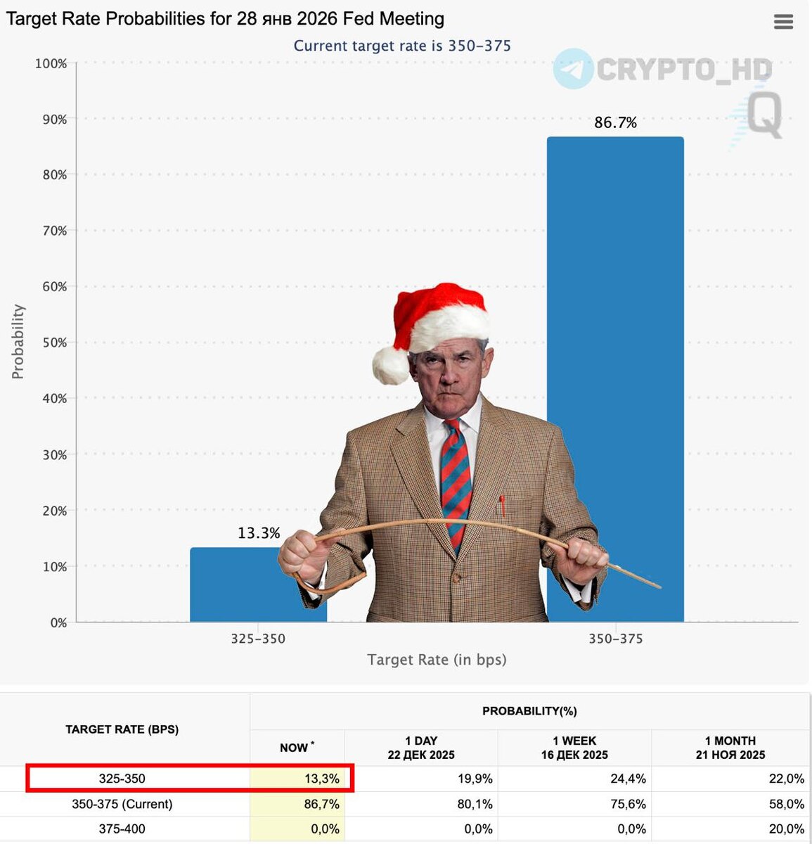💥 FedWatch: Вероятность снижения ставки ФРС в январе обвалилась до 13,3% (ранее = 28,8%).