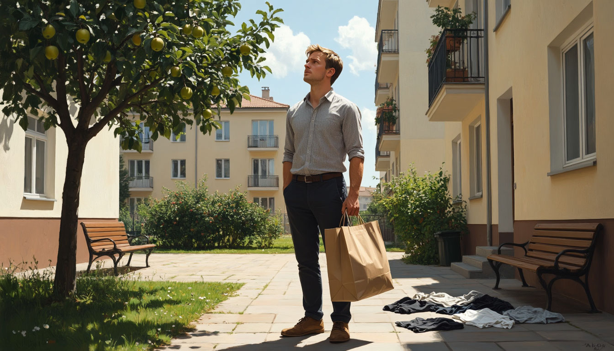Я стоял посреди двора с пакетом продуктов и смотрел, как из окна третьего этажа вылетают мои вещи. Рубашка зацепилась за ветку яблони. Кроссовки шлёпнулись в грядку с укропом у Петровны. Следом полетели носки — россыпью, как конфетти на каком-то дурацком празднике.
