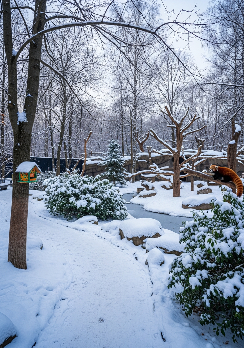 Зимой панды особенно активны — они играют со снежками, катаются с импровизированных горок и с удовольствием валяются в снегу. Посетители могут наблюдать за пандами как в теплом павильоне, так и в уличных вольерах, где созданы все условия для комфортной зимовки.
