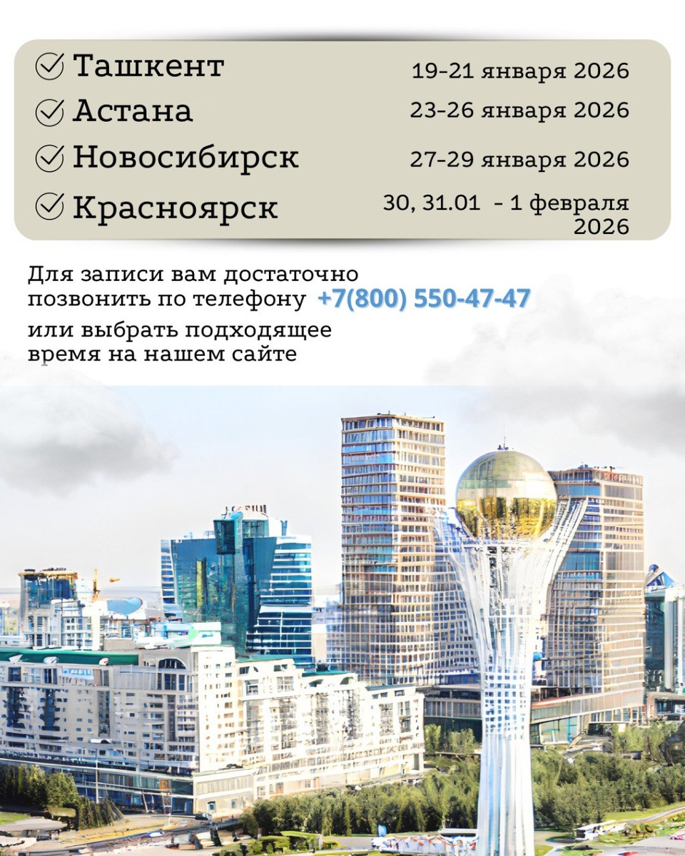 ✈ География Центра имени Юрия Репина огромная. В январе мы отправляемся за пределы России, а также снова в Сибирь, туда, где нас ждут, где просят приёмы и где помощь особенно нужна. Тысячи километров, разные города и страны — но одна цель: помочь людям избавиться от боли, вернуть подвижность и начать год в своём теле по-новому. Если вы ждали наш приезд именно в этих городах — этот тур для вас. 📌 Расписание и адреса 🔹 19–21 января — Ташкент 👨⚕ Специалист: Ковалевский С. В. 📍 Перекрёсток Шастри, ориентир Credit Asia Здание, где находятся «Этажи» и «Embassy of Burgers», 5 этаж (в Яндекс.Картах: The Beauty Lab или Мирзо-Улугбека, 55) 🔹 23–26 января — Астана 👨⚕ Специалист: Ковалевский С. В. 📍 г. Астана, ул. Сарайшык, 38 🔹 27–29 января — Новосибирск 👨⚕ Специалист: Ковалевский С. В. 📍 г. Новосибирск, ул. Семьи Шамшиных, д. 18, коворкинг «ЭРА» 🔹 30–31 января и 1 февраля — Красноярск 👨⚕ Специалист: Ковалевский С. В. 📍 г. Красноярск, ул. Мужества, д. 10, ТЦ «Зелёный», 2