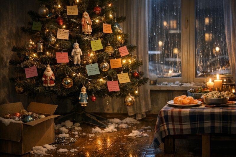 — Так, — сказала она, как будто объявляла новое правило игры. — У нас будет новая традиция. Смотрите. Каждый пишет на бумажке, за что он благодарен этому году. Хоть одну вещь, хоть десять. Можно смешное, можно серьёзное. Можно неровным почерком. А потом мы все эти записки повесим на ёлку.