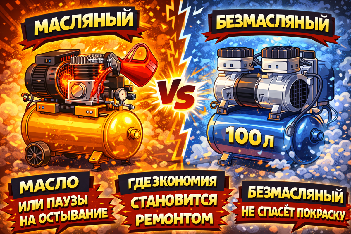 Главная развилка при покупке — масляный или безмасляный. И вот тут люди чаще всего экономят не там: берут безмасляный “чтобы воздух был чистый”, а потом борются с влагой, падением давления и постоянными паузами.