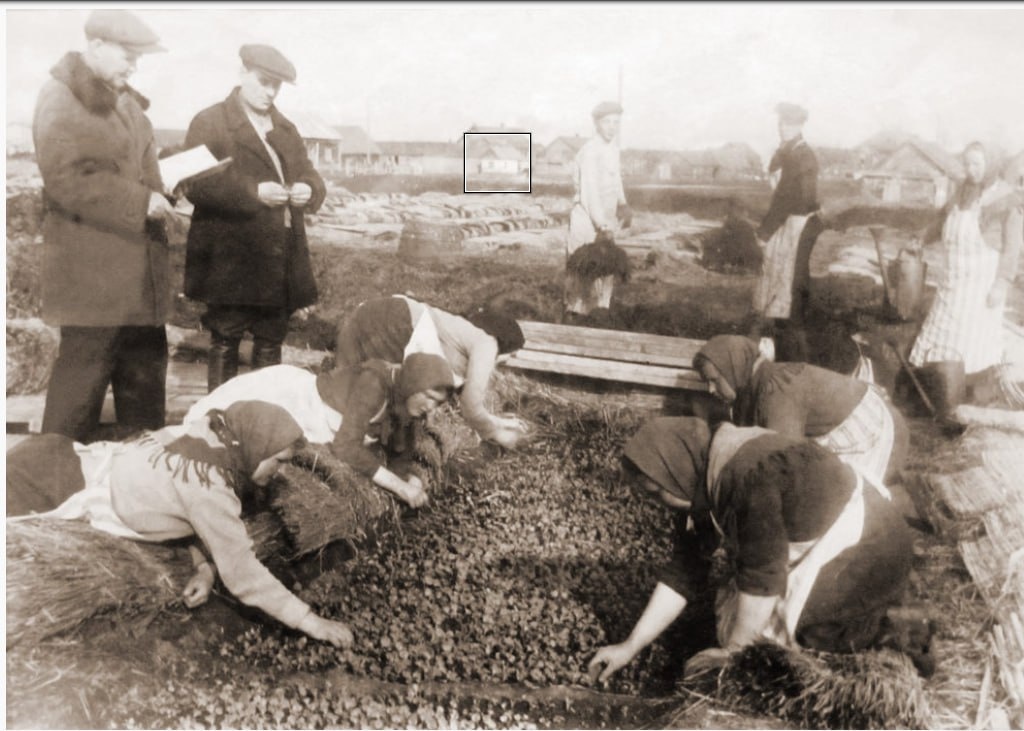 1939 Москва, ЮАО, Нагатинский затон, Музей-заповедник Коломенское Второе звено парниковой бригады во время пикировки рассады капусты в парниках. Ленинский район Московской области. 1939. На фото слева агроном Курбаткин (с тетрадью)