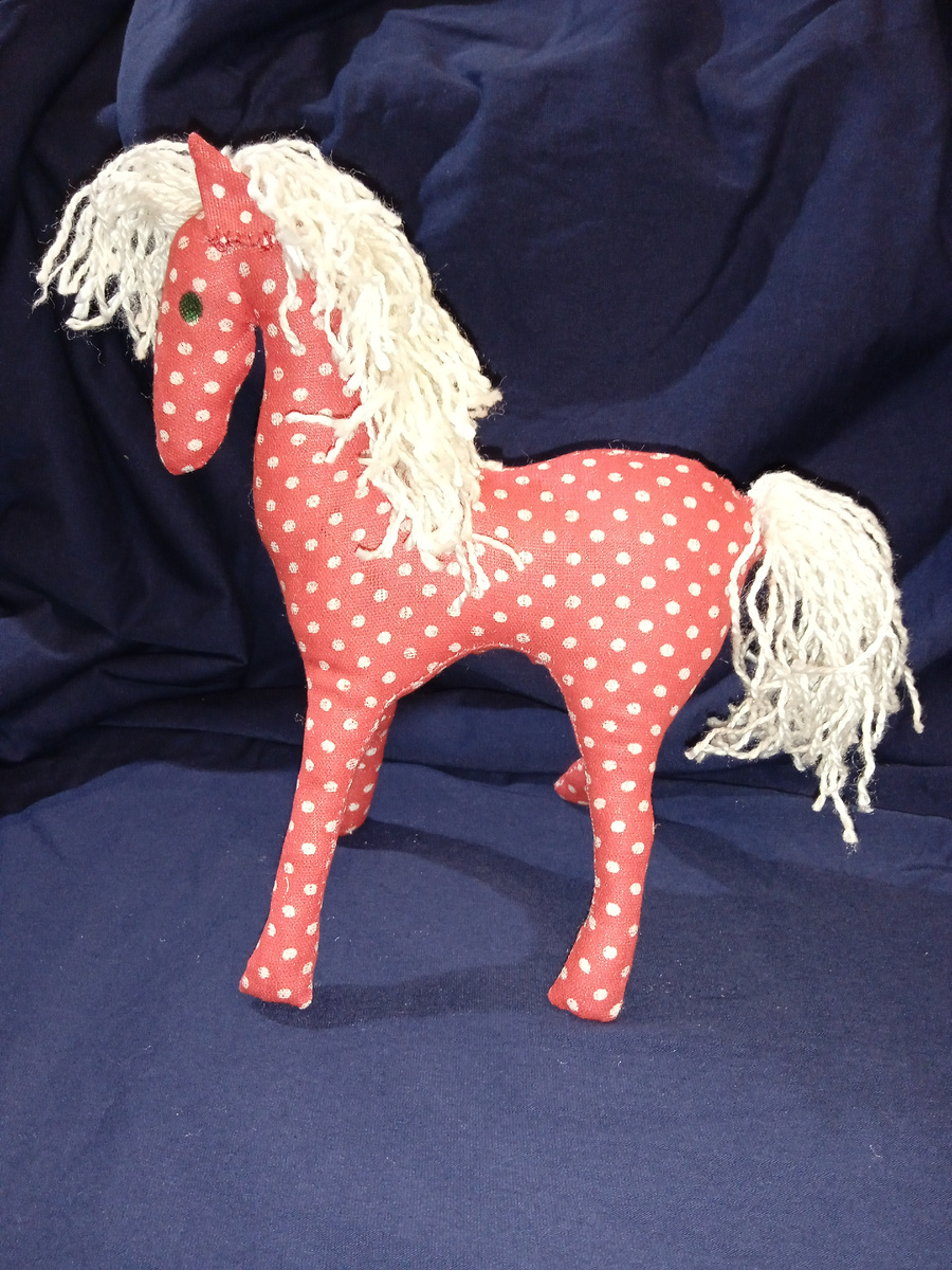 К наступающему Новому году, году огненной лошади сшила текстильную лошадку. Сначала сделала выкройку из бумаги. Затем выкроила все детали игрушки на ткани. Шила из красного ситца в белый горошек. Две основные детали, внутренняя сторона ног - одна деталь со сгибом, уши - две детали. Необходимо точно обвести выкройку, чтобы сострачивать детали по этой линии. Припуски на швы 0,5 см. Сначала пристрочила внутреннюю часть ног, строчила по ней. Затем на одну из основных деталей настрочила гриву и хвост из белых ниток для вязания. Аккуратно вложила гриву и хвост между двумя основными деталями и сострочила их. Срезала углы на копытах и, надсекла не доходя до строчки 0,1 см., все внутренние углы игрушки. Аккуратно вывернула лошадку через дыру рядом с хвостом. Набила плотно синтепоном. Зашила дыру. Пришила уши. Маркером нарисовала глаза. Получилась яркая лошадка. Надеюсь, что статья была вам полезна. Больше текстильных игрушек смотрите в подборке "Текстильные игрушки". Подписывайтесь на мой ка