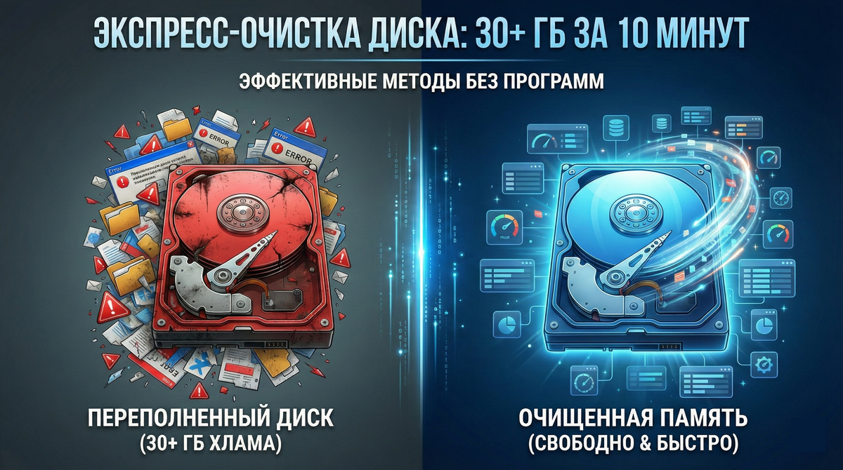 Многие сталкивались с проблемой, когда на системном диске остается критически мало места, и он подсвечивается красным. Очистить пространство можно довольно просто и быстро, не прибегая к сторонним программам. Эта инструкция актуальна для Windows 11, но также подойдет для «десятки», «восьмерки» и даже «семерки». Подпишись на телеграм канал Первым делом воспользуемся встроенным инструментом Windows. Следующий шаг — ручная очистка папки с временными файлами пользователя. Эти системные элементы могут занимать десятки гигабайт. Файл гибернации (hiberfil.sys) может занимать огромный объем, особенно на компьютерах с большим количеством оперативной памяти. Если вы не используете режим гибернации, его можно отключить одной командой. Часто диск C забивается файлами в папках «Загрузки», «Рабочий стол» и «Документы». В самой папке Windows тоже есть места, где скапливается хлам. Если диск C физически мал, а рядом есть диск D на том же носителе, их можно объединить. После проведения этих несл