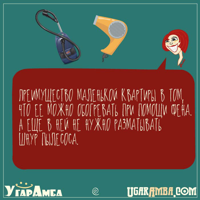 Преимущество маленькой квартиры в том, что её можно обогревать при помощи фена. А ещё в ней не нужно разматывать шнур пылесоса.