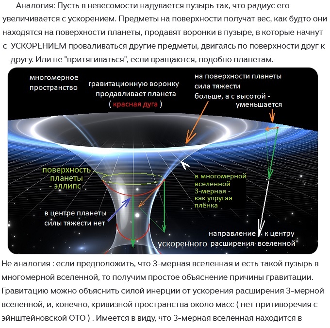 .....Вполне может быть, что массы не притягивают друг друга, а притяжение происходит из-за силы инерции от расширения вселенной. многомерной вселенной. И не факт, что в четырёхмерной. Теории струн предполагают, что для гравитации нужны 10 измерений, кроме времени. И хотя они «сворачивают» их, но как знать - не существуют ли они в многомерной вселенной. Принцип "что наверху - то и внизу" универсален. Если в микроМире - частицы, то и в макроМире - тоже должны быть они. 3D -вселенная - частица материи в какой-нибудь 10-мерной вселенной, а та - частица в ещё какой-нибудь 126-мертной и так - до бесконечноМерности... Не до пустого гильбертова пространства, а до бесконечно-сложного устройства, которое не хочется называть структурой... Оно же и разумно... ...Расширение 3-мерной вселенной в многомерной может оказаться и незаметным непосредственно. Например, если размер вселенной увеличится в 2 раза, а размеры материи в ней - тоже в 2, то относительно размеров людей такая вселенная окажется стац